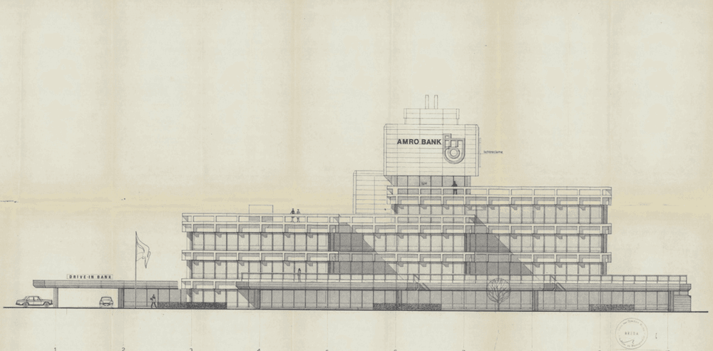 Aan de overkant van de straat het voormalige kantoor van ABN/Amro. Het kantoor is gebouwd in 1975 en is een voorbeeld van de Post ’65-architectuur. Het pand is gebouwd in Brutalistische stijl wat af te lezen is aan het gebruik van ruw beton. Bij het ontwerp is ook rekening gehouden met landgoed Weilust met als resultaat dat het kantoor een tegenhanger vormt van het landgoed: oud en nieuw geld staan hier naast elkaar.