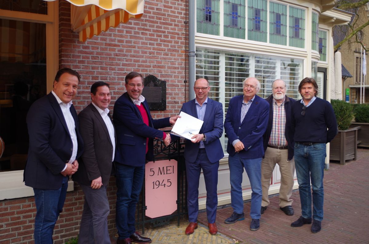 Op de foto.v.l.n.r. Ronald Busser en Joost Roosendaal (bestuursleden, Heemschutdirecteur Karel Loeff (voorzitter), notaris Bijma, Ad van Liempt (bestuurslid), Jan Kijlstra (secretaris) en René van Heijningen (bestuurslid). Roderick Zoons, directeur van Recreatiecentrum de Goudsberg, is eveneens benoemd in het bestuur, maar ontbreekt wegens verblijf in het buitenland.